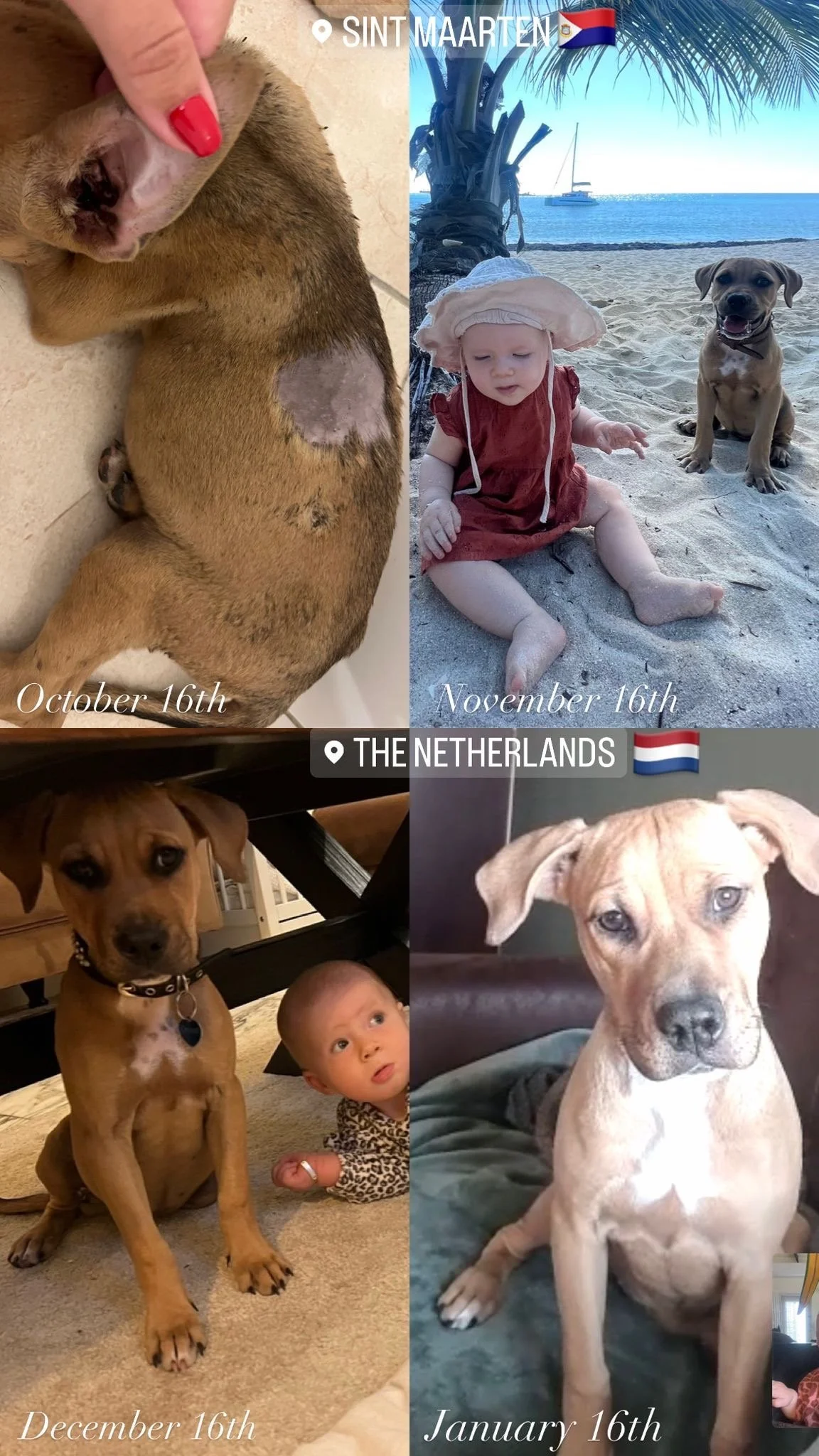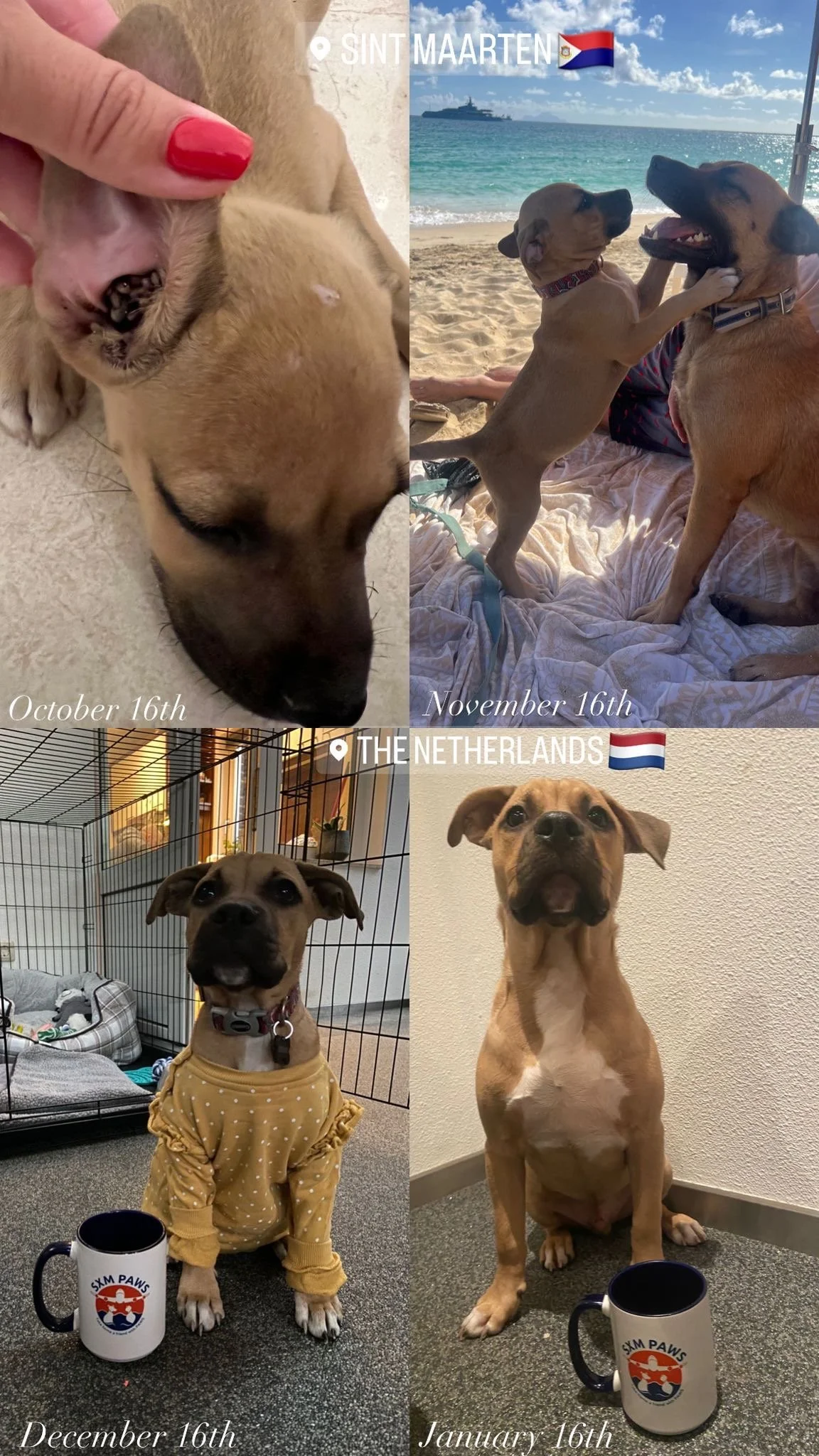They lived with us for seven weeks. When we took them in, they looked so battered, covered in dirty ticks, but today they have grown into friendly, beautiful dogs. We've had so much fun with them, taking daily trips to the beach and gently playing with our little daughter Ozéa. Every three weeks, we took them to the vet for vaccinations. They flew with us to Amsterdam and later traveled with us by car to Maastricht, where they now live with their forever families!