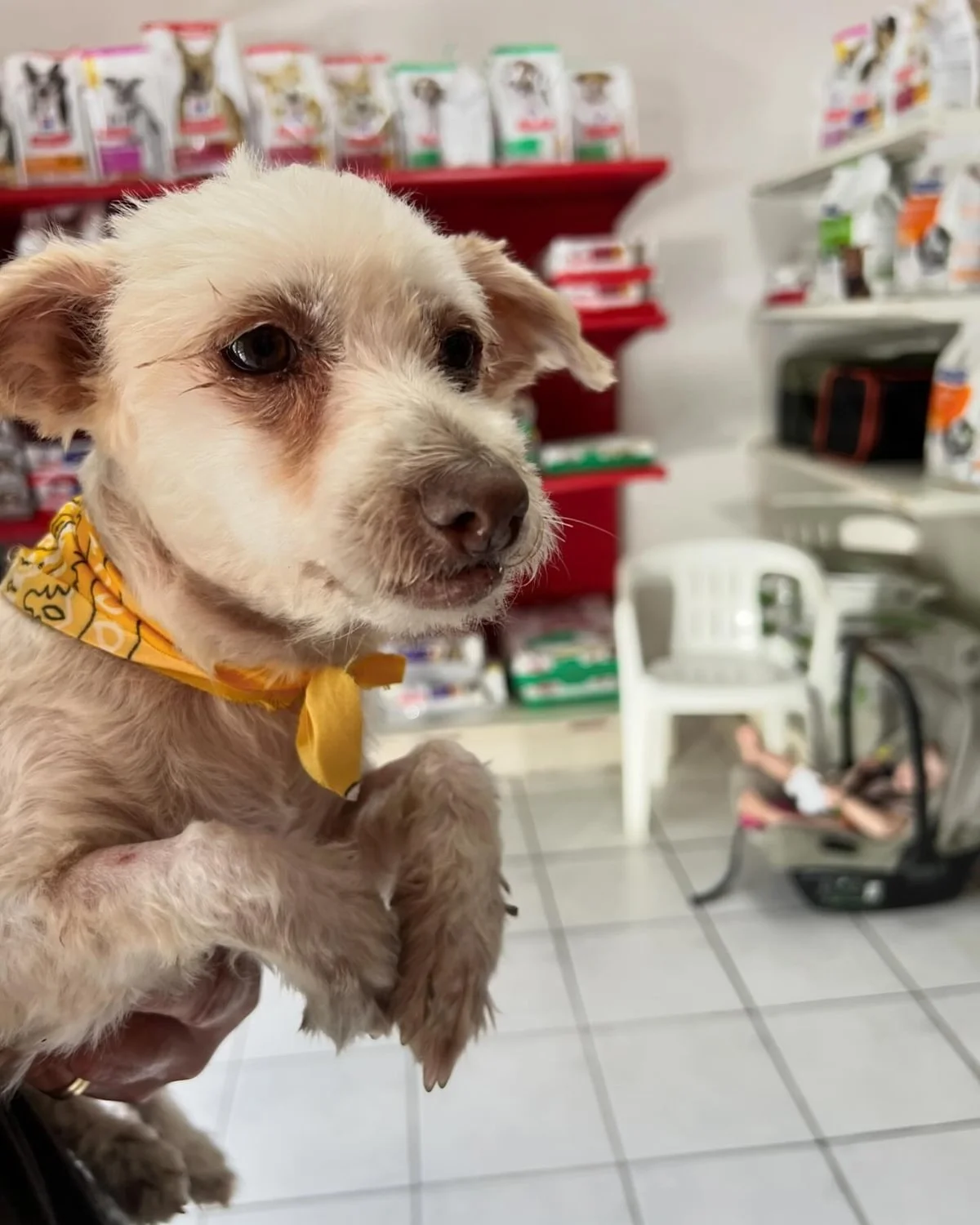 Severely neglected after living on the streets for a long time, tangled and dirty hair. We managed to trap her and bring her to the vet. The vet was overcrowded, so Polar had to stay overnight and undergo the sterilization the next morning. She received a much-needed wash and trim immediately.